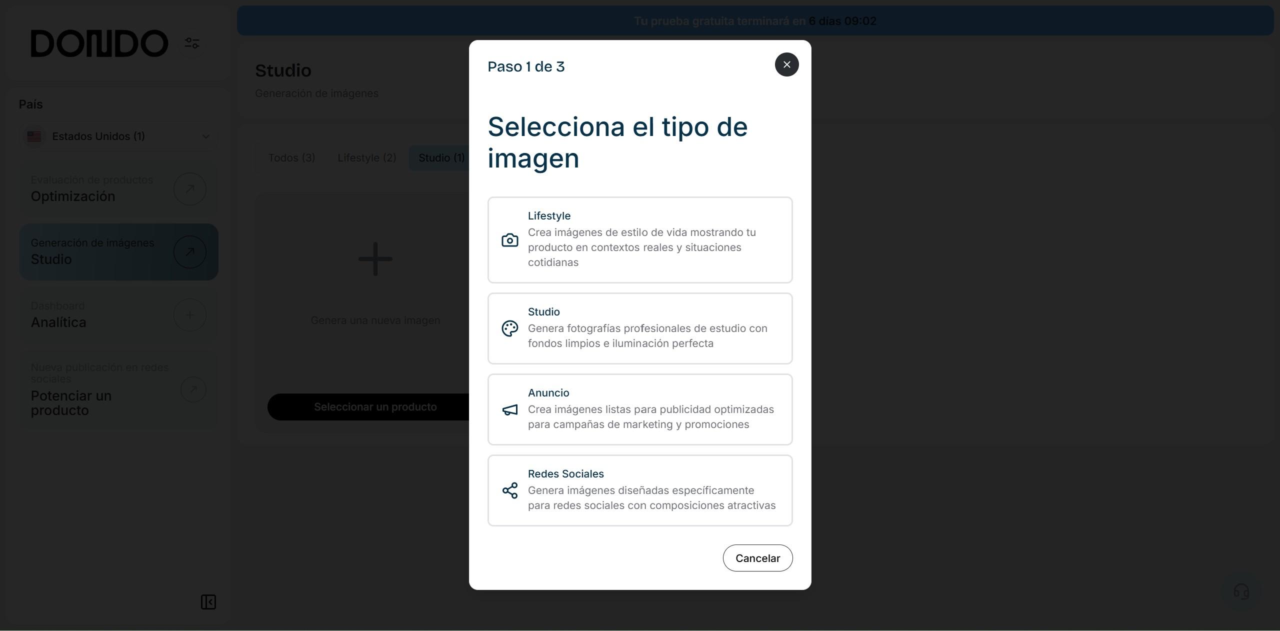 3. Elige el tipo de imagen que quieres crear: estudio, lifestyle, redes sociales o anuncio