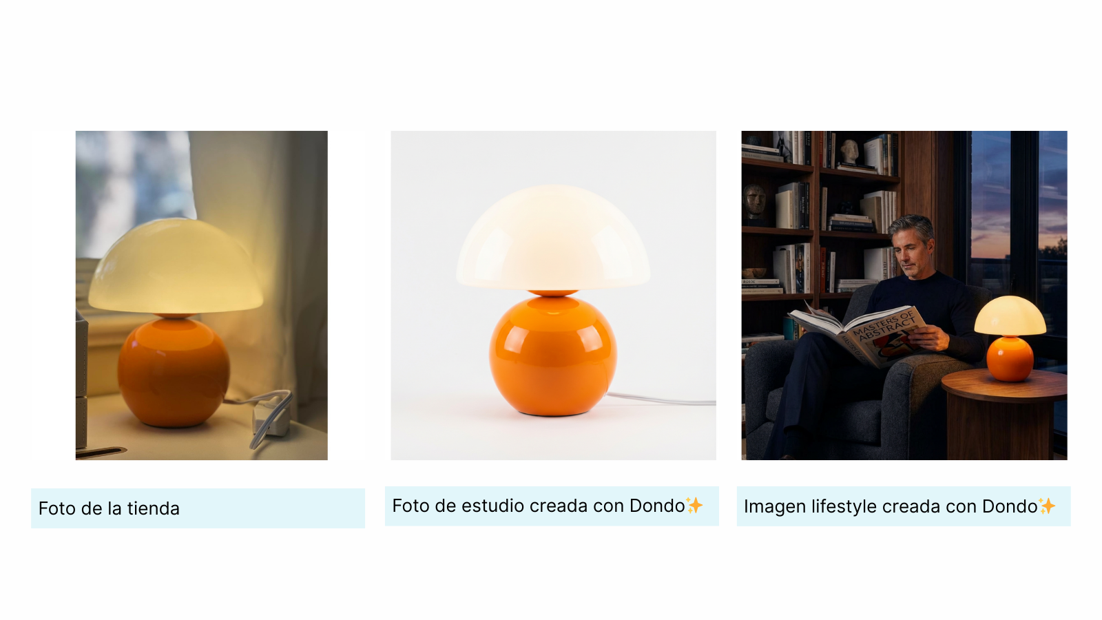 - Dondo genera imágenes de estudio de alta calidad y consistencia para que tus productos y tu tienda se vean profesionales desde el primer instante.