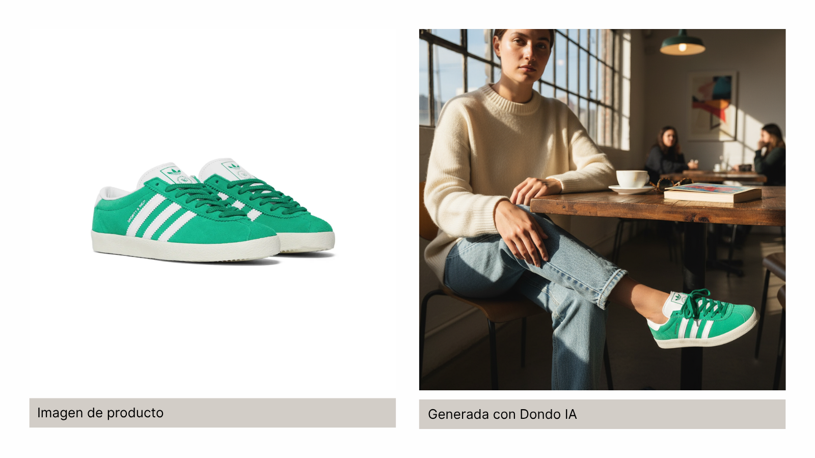 | Tono y estilo | Requiere dirección creativa para alinearla sesión con el estilo y tono de la marca. | Fotos genéricas, no están alineadas con la identidad visual de la marca | Dondo extrae tu voz de marca y la usa para generar imágenes con tu estilo e identidad. |