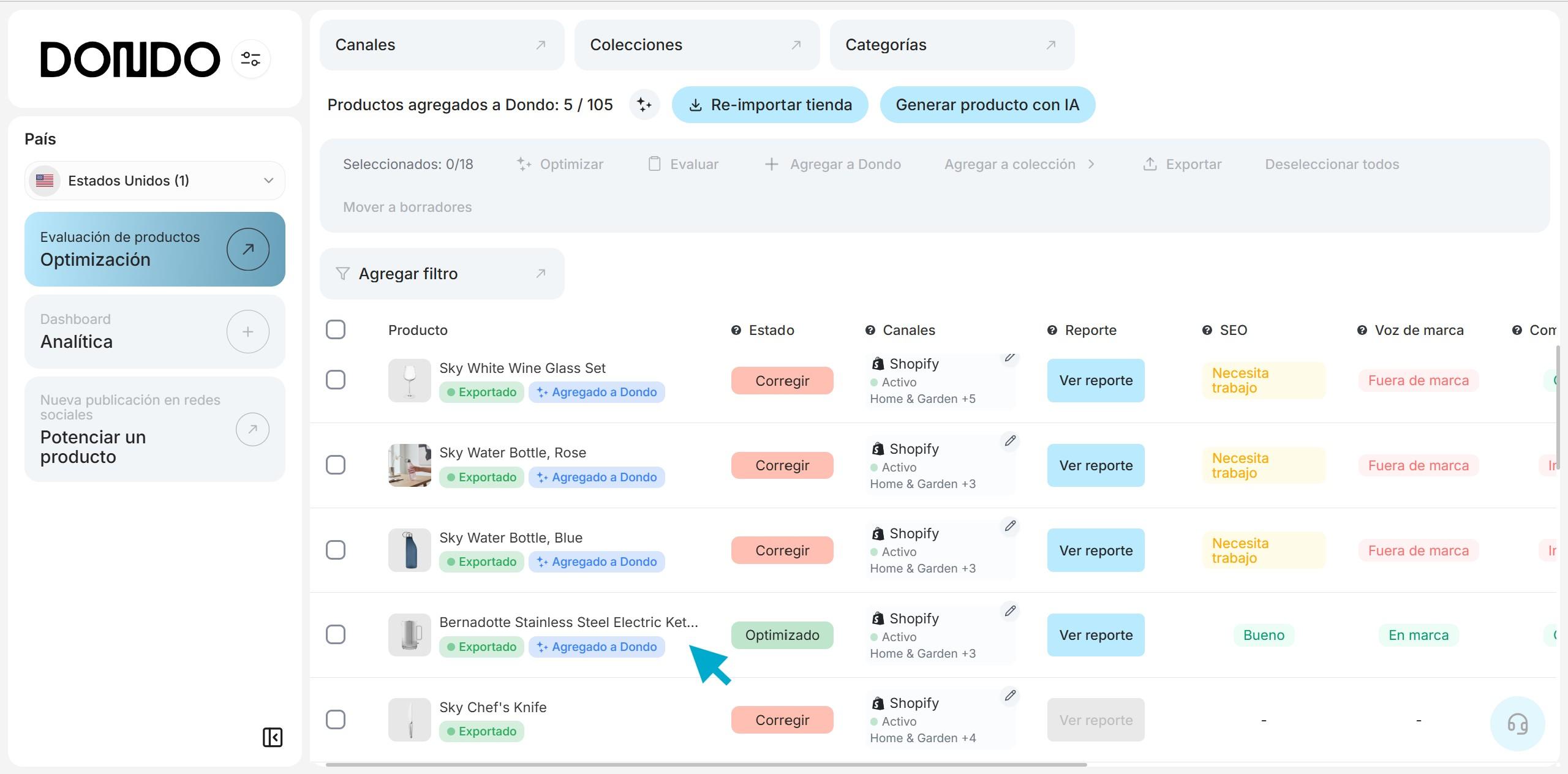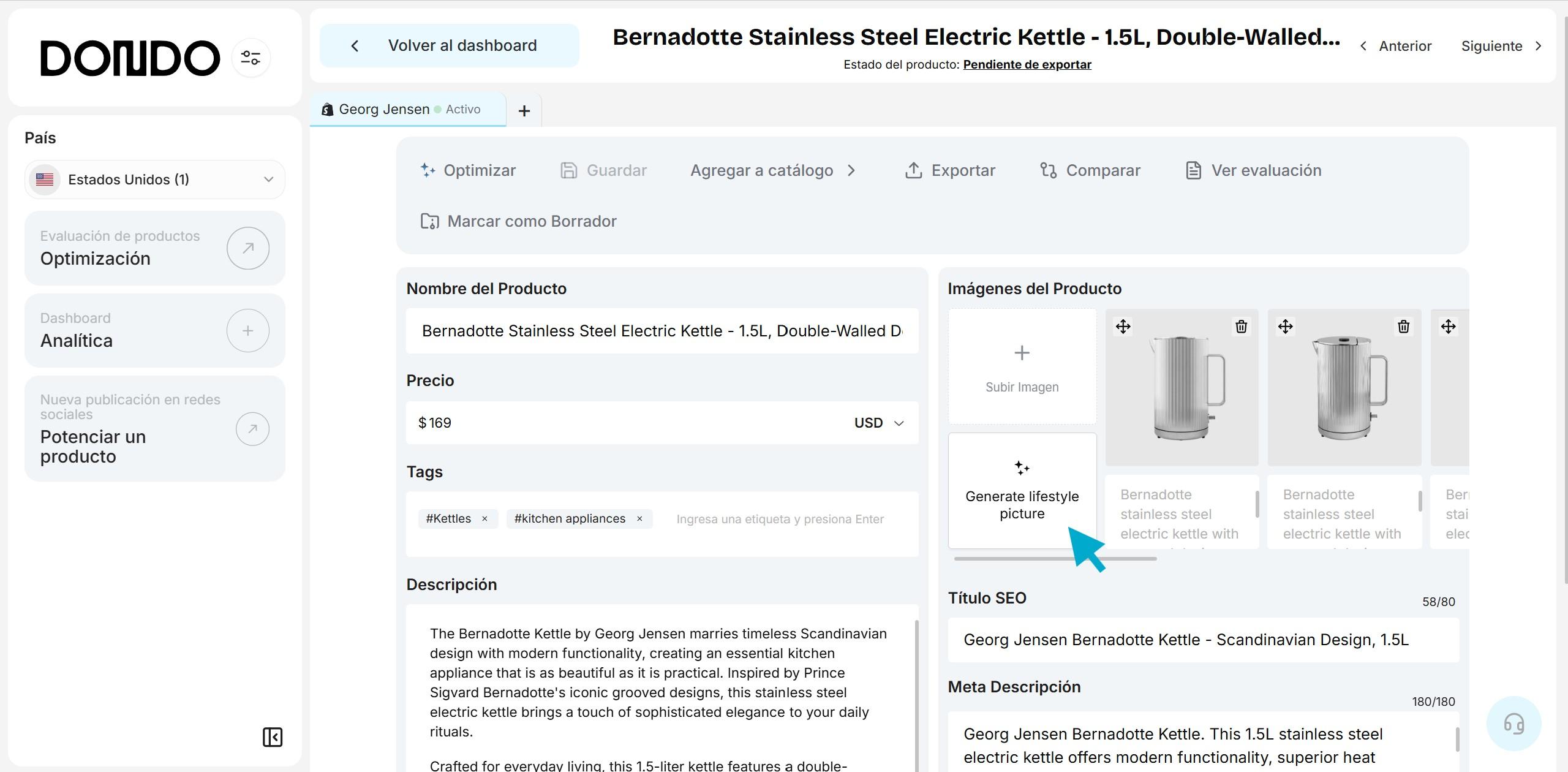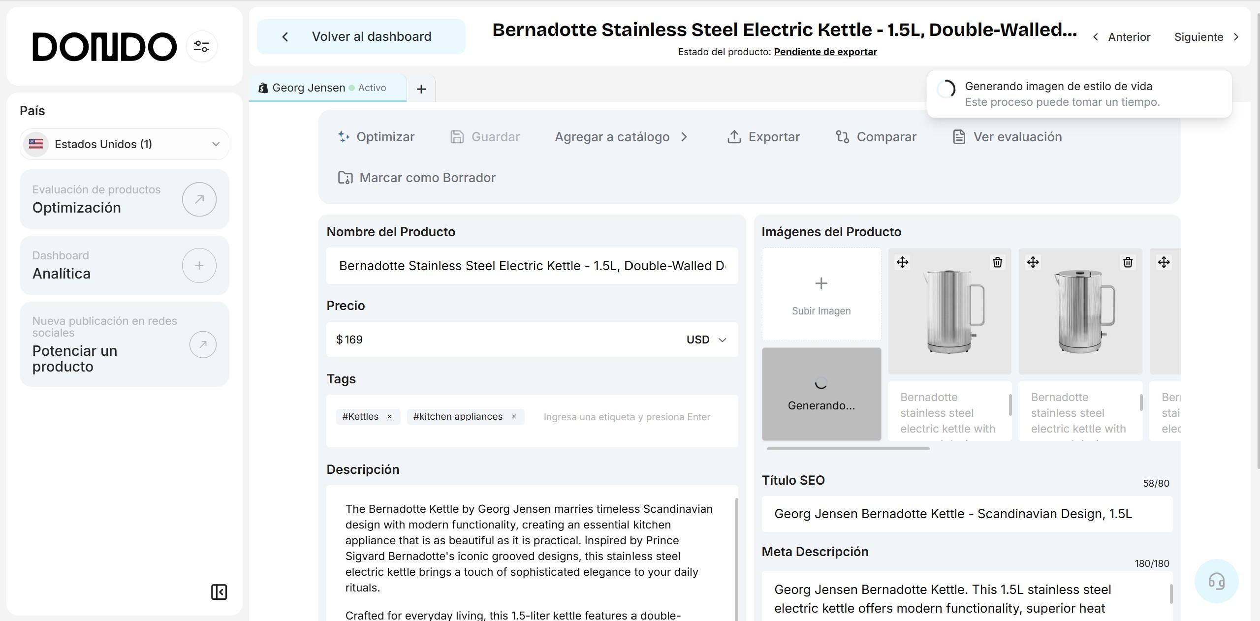 Después de crear tu cuenta y conectar tu tienda, ingresa el nombre y URL de tu tienda para que Dondo pueda extraer tu voz de marca, analizar tu buyer persona y tus competidores. Con este contexto la IA de Dondo optimiza el contenido de tus productos (títulos, descripciones, metadatos SEO, y keywords) y genera imágenes lifestyle alineadas con el estilo de tu marca, incluyendo modelos y escenarios familiares y atractivos para tu audiencia, y ayudándote a destacar frente a competidores que venden productos similares.