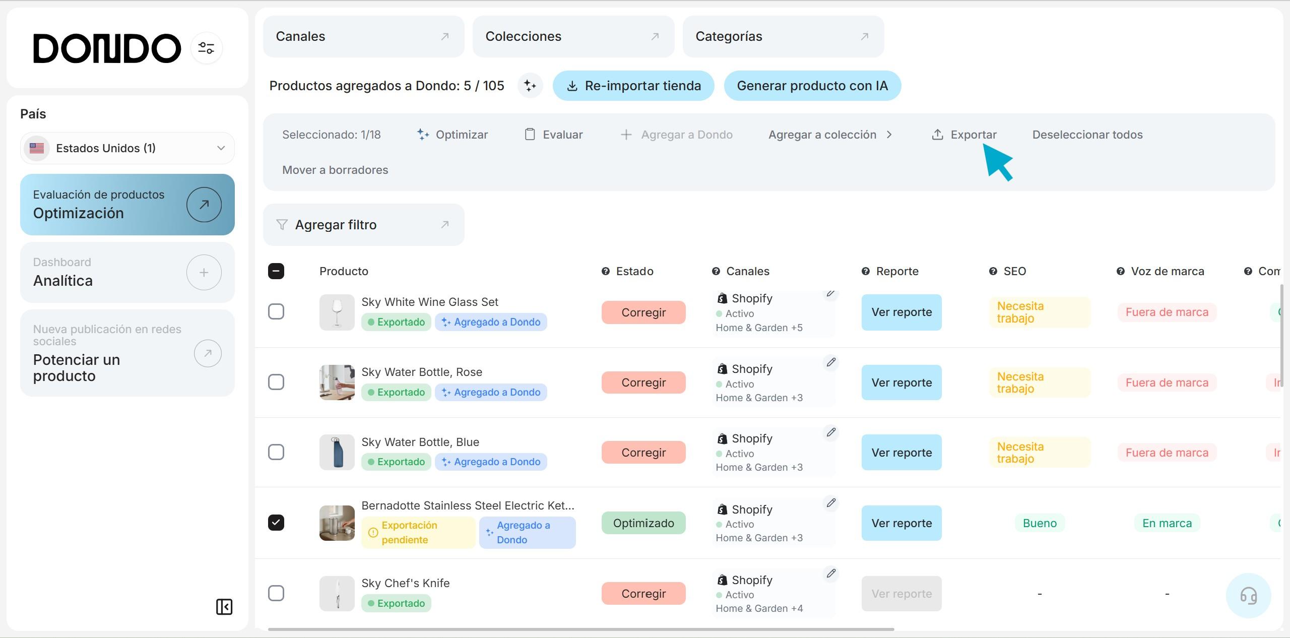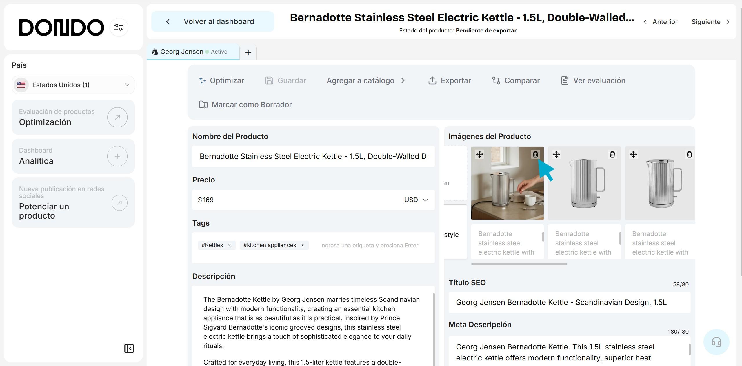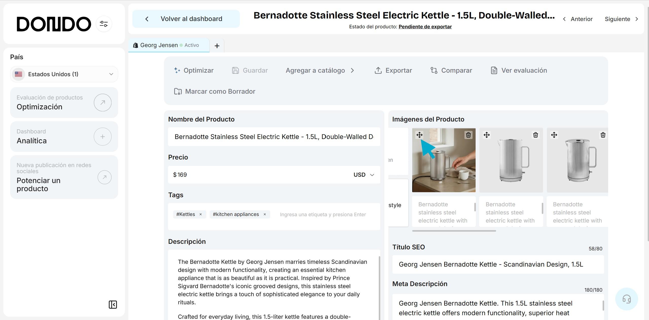 Después de crear tu cuenta y conectar tu tienda, ingresa el nombre y URL de tu tienda para que Dondo pueda extraer tu voz de marca, analizar tu buyer persona y tus competidores. Con este contexto la IA de Dondo optimiza el contenido de tus productos (títulos, descripciones, metadatos SEO, y keywords) y genera imágenes lifestyle alineadas con el estilo de tu marca, incluyendo modelos y escenarios familiares y atractivos para tu audiencia, y ayudándote a destacar frente a competidores que venden productos similares.