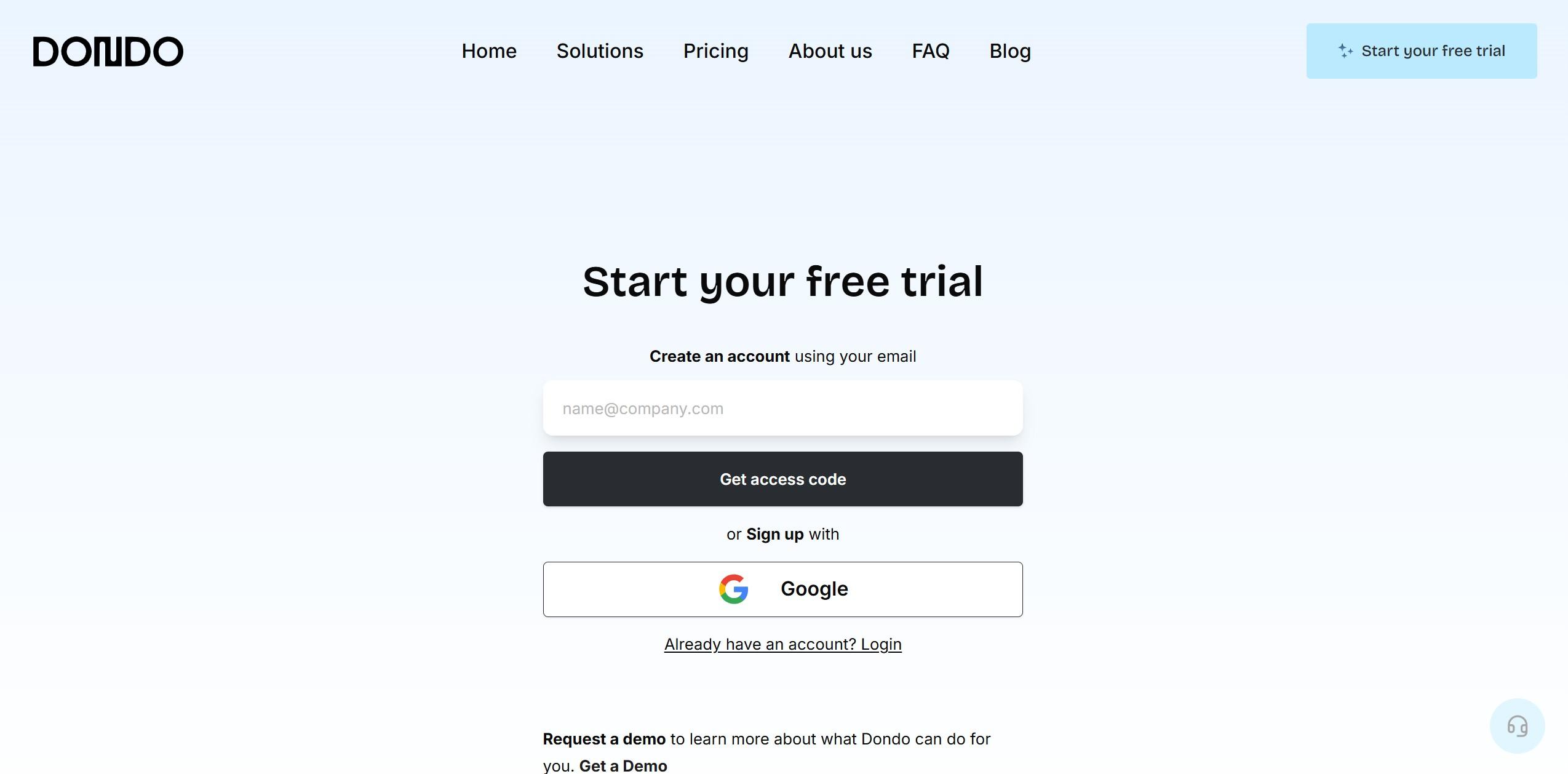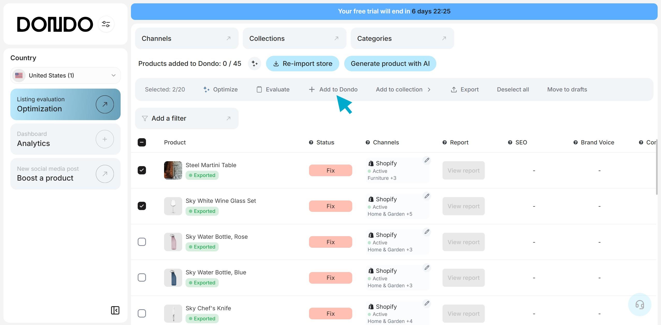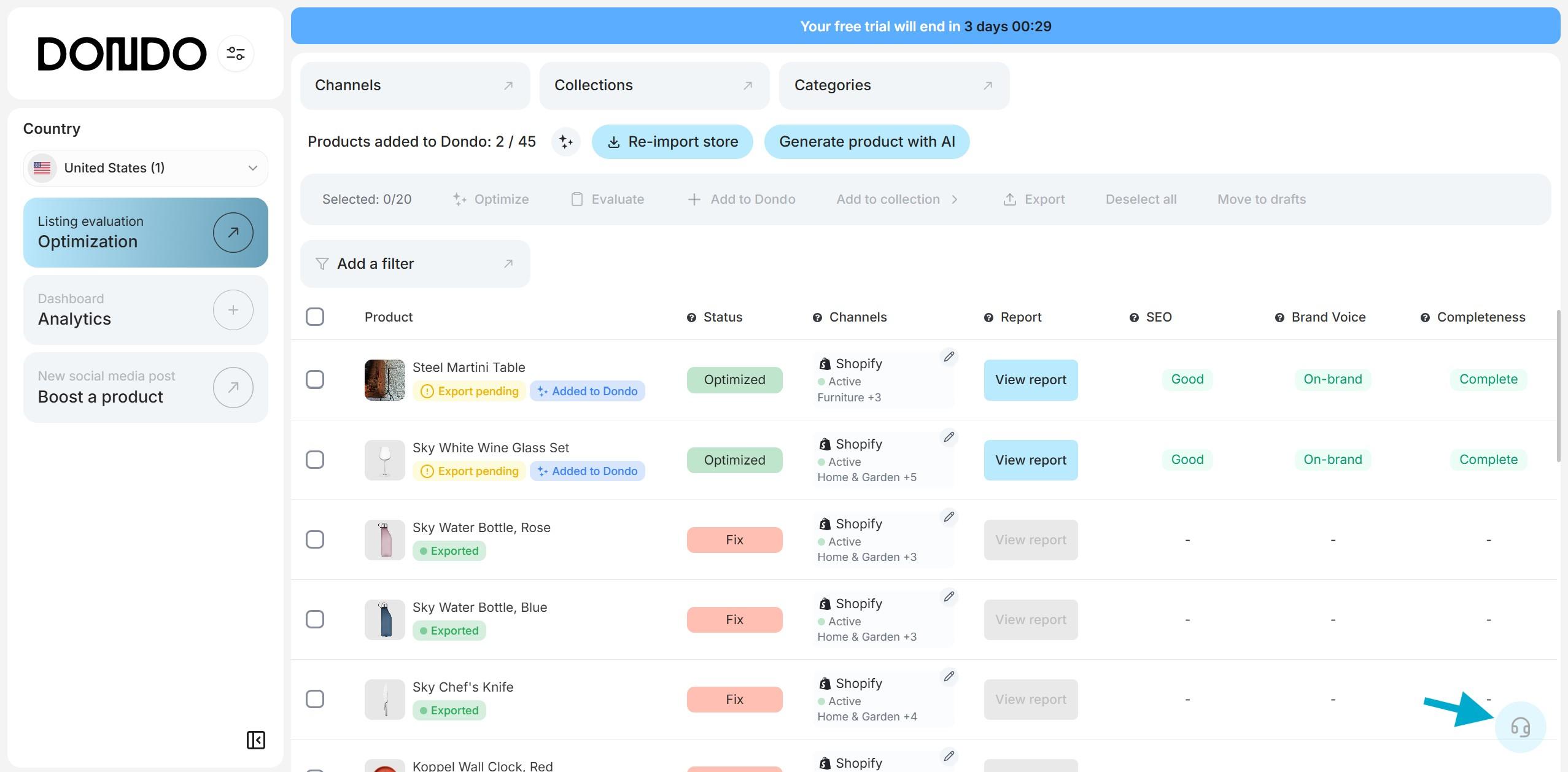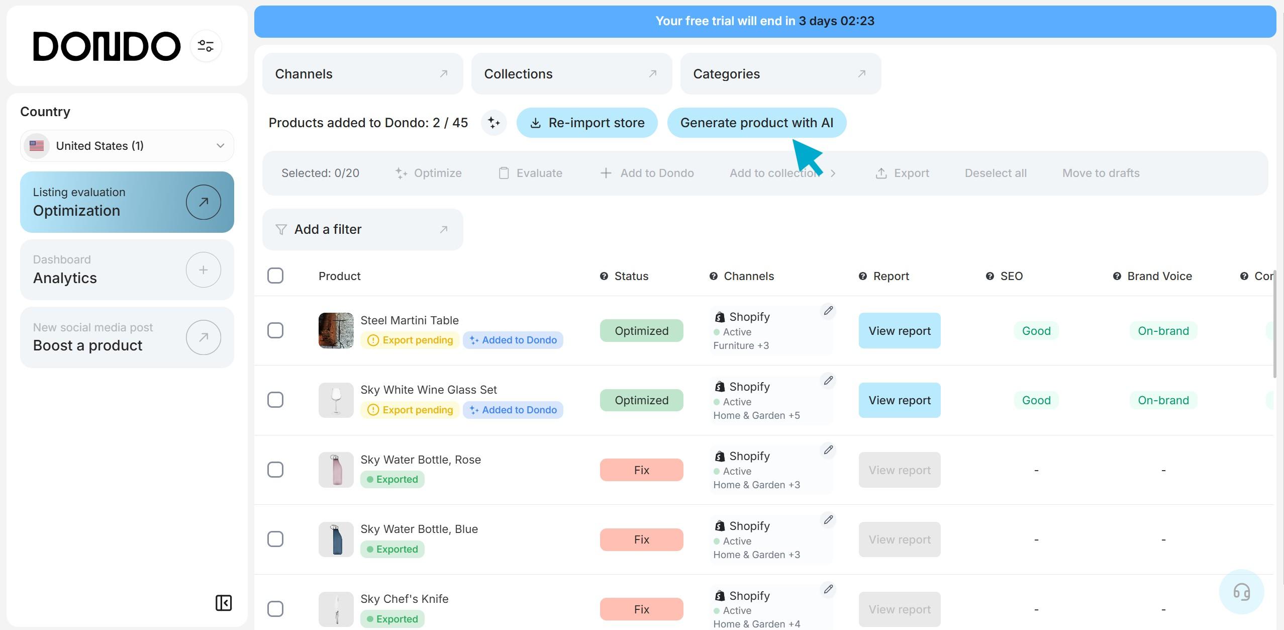 You can explore Dondo without starting a free trial by using the demo store, but to connect your own store and optimize your products, you need to start a free trial on one of the available plans (See plans). During the trial, you’ll be able to use all the features of your plan at no cost: evaluate and optimize products, generate social media posts, and create products with AI.