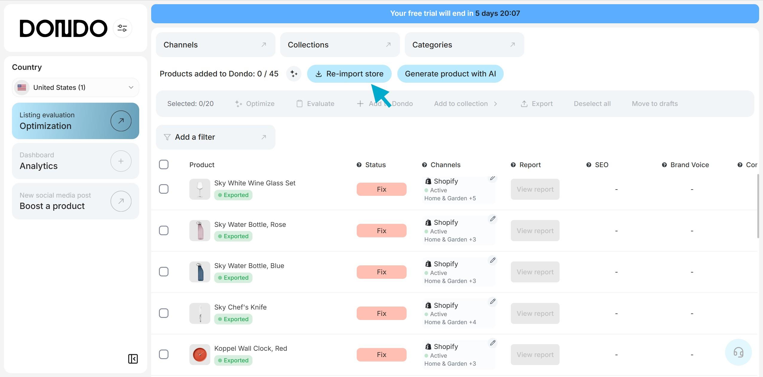 Once your store is connected, Dondo automatically imports all your products so you can evaluate and optimize them. You can also add new products at any time by using the "Re-import" store button. The import process is fast and lets you start optimizing your catalog in minutes.
