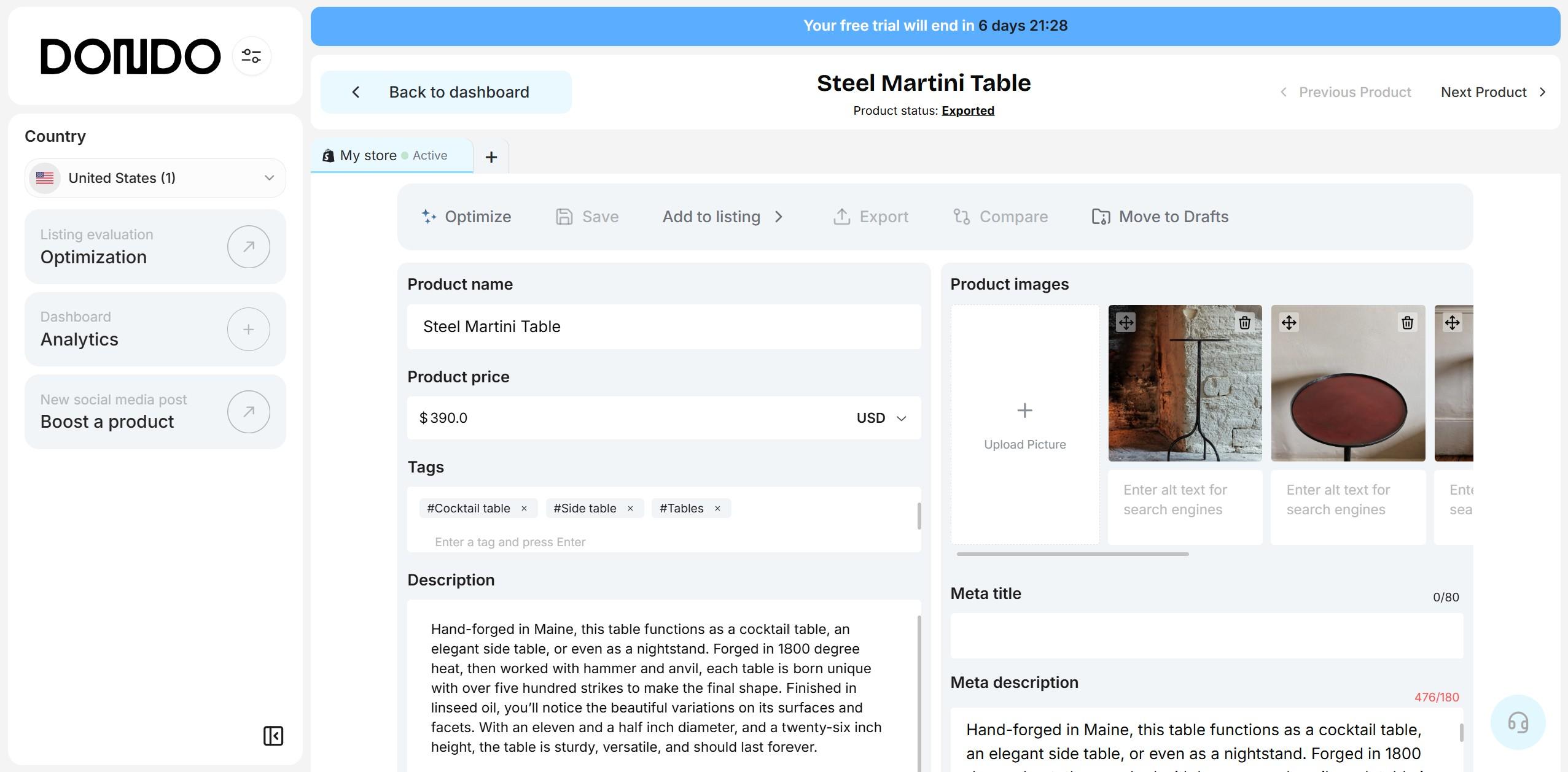 By clicking on the product name, you can view the details, compare the optimized version with the original, edit it, and export it to your store if you wish.