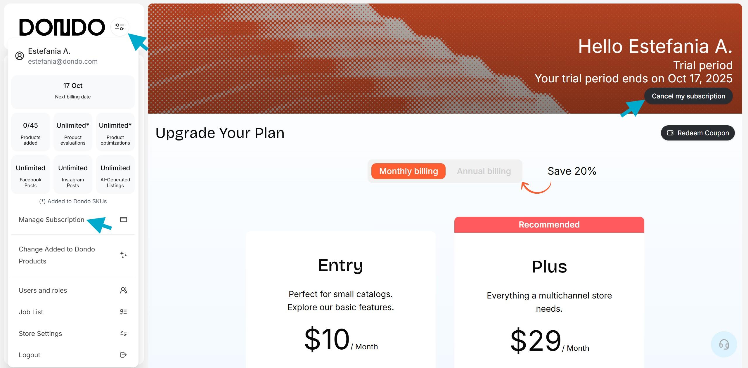 It’s important to cancel before your next billing date to avoid additional charges. Once canceled, you’ll still have access to your plan until the end of the billing period and will be able to keep your products and optimizations in Dondo as long as you maintain your account.