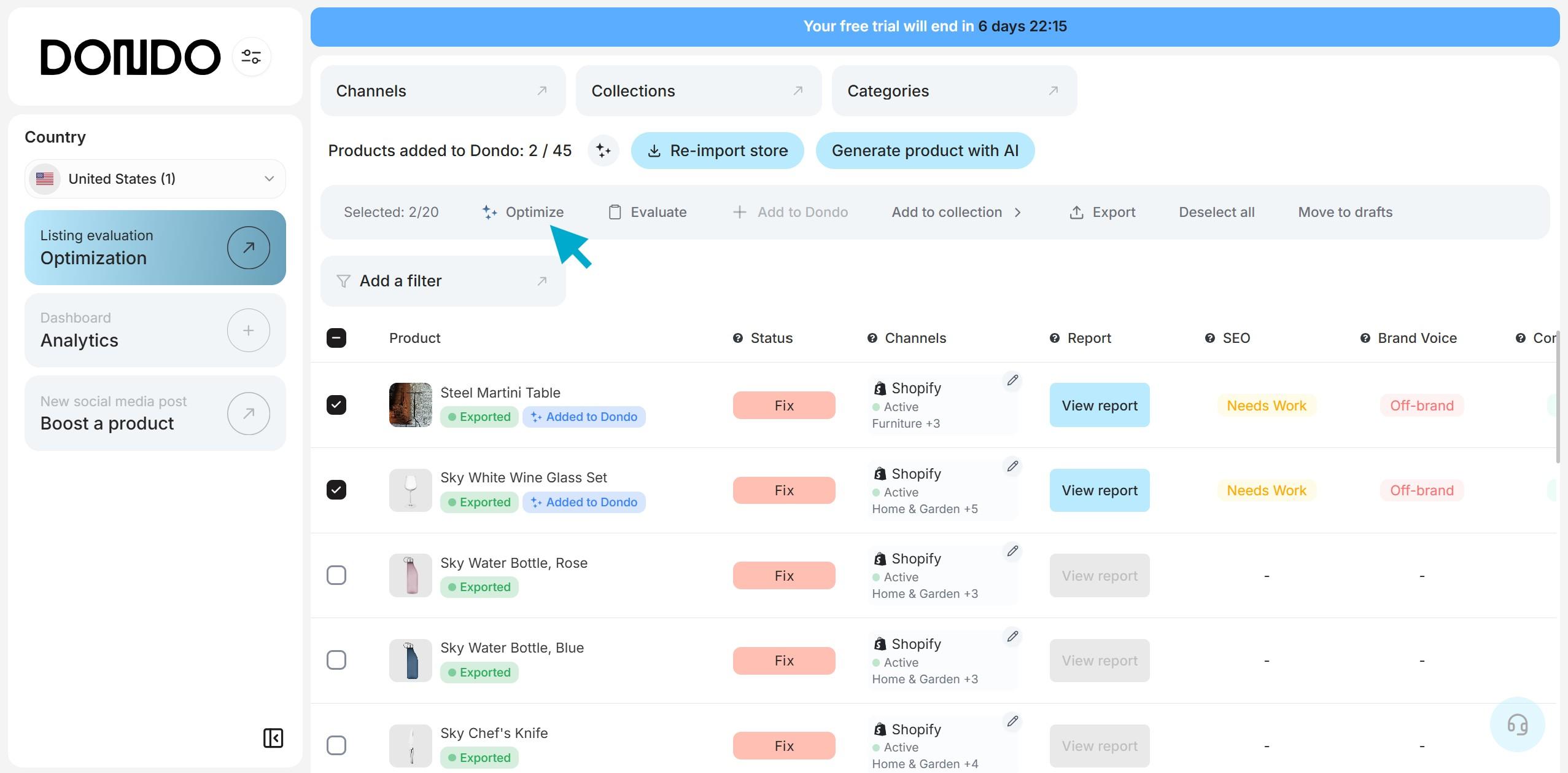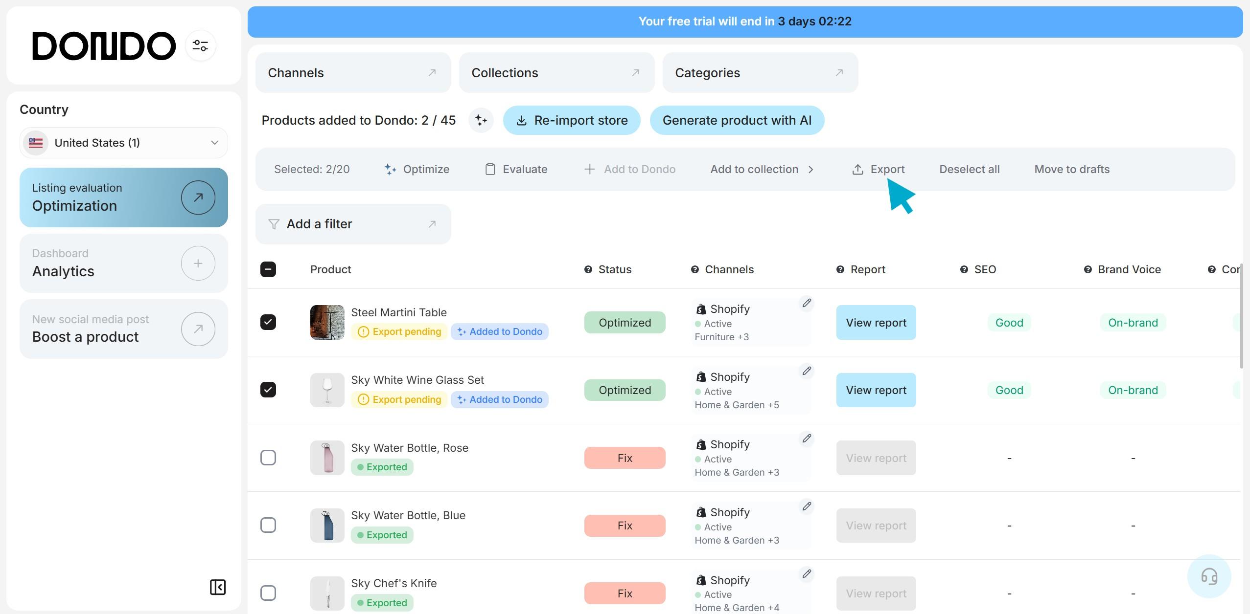 On all platforms, you can add products to Dondo, receive detailed evaluation reports, apply personalized optimizations, and export changes directly to your store.
