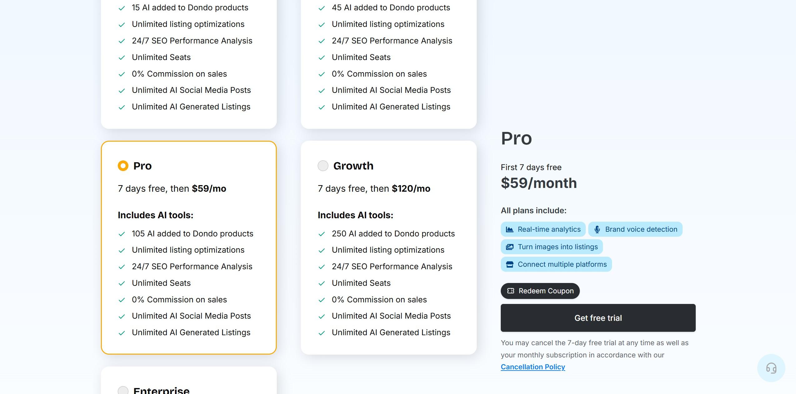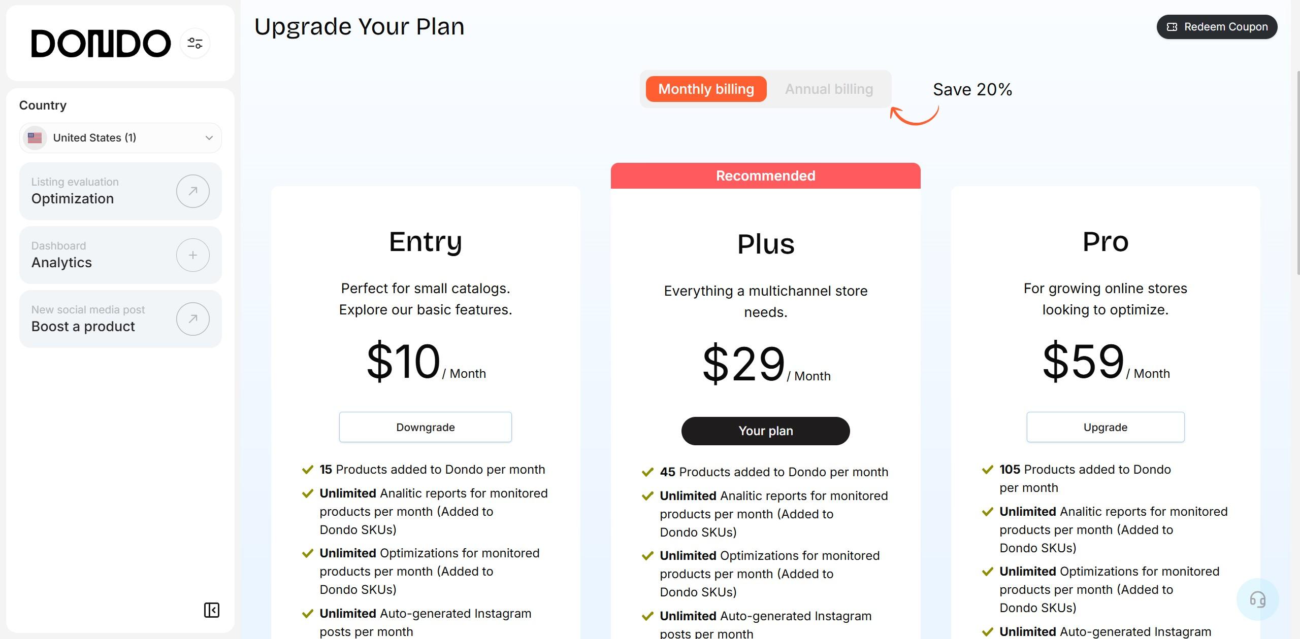 Dondo offers different plans designed to fit your business size and the number of products you manage. Each plan includes a specific number of products you can add, as well as access to all evaluation, optimization, social media post generation, and AI product creation features.