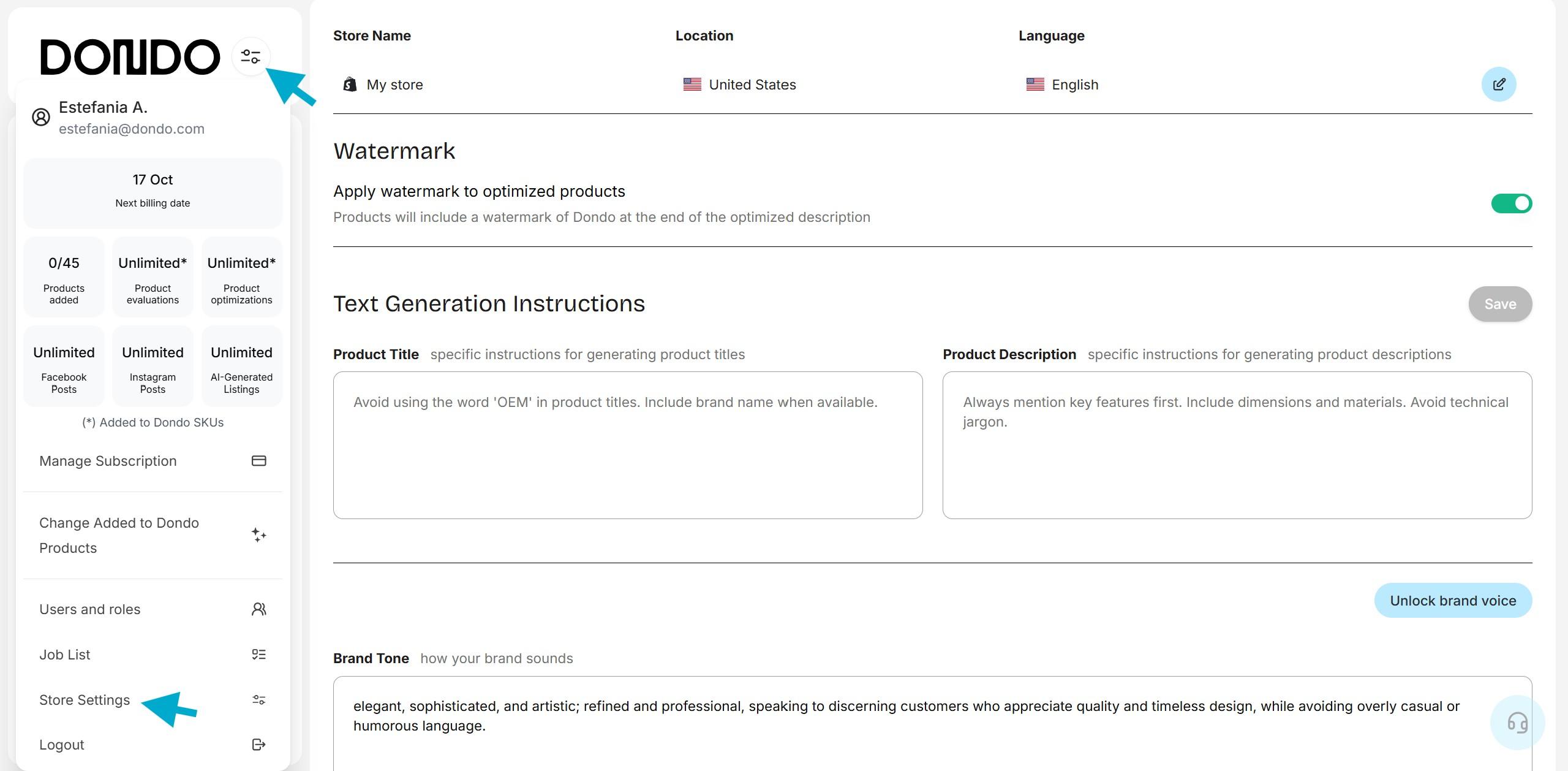 Open the menu located at the top left of your screen, select Store Settings, and click View Settings. From there, you can view and edit your store settings, including your brand voice report.